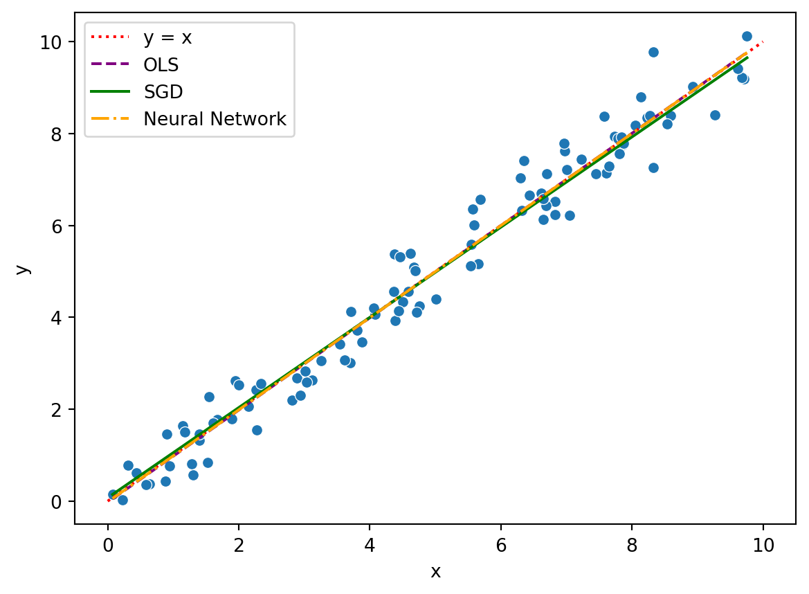 Once again we see our weight/coefficient is close to one and the bias/intercept is close to zero, as expected. OLS, SGD, and neural networks all give us approximately the same result when fitting a linear model to our simple dataset: