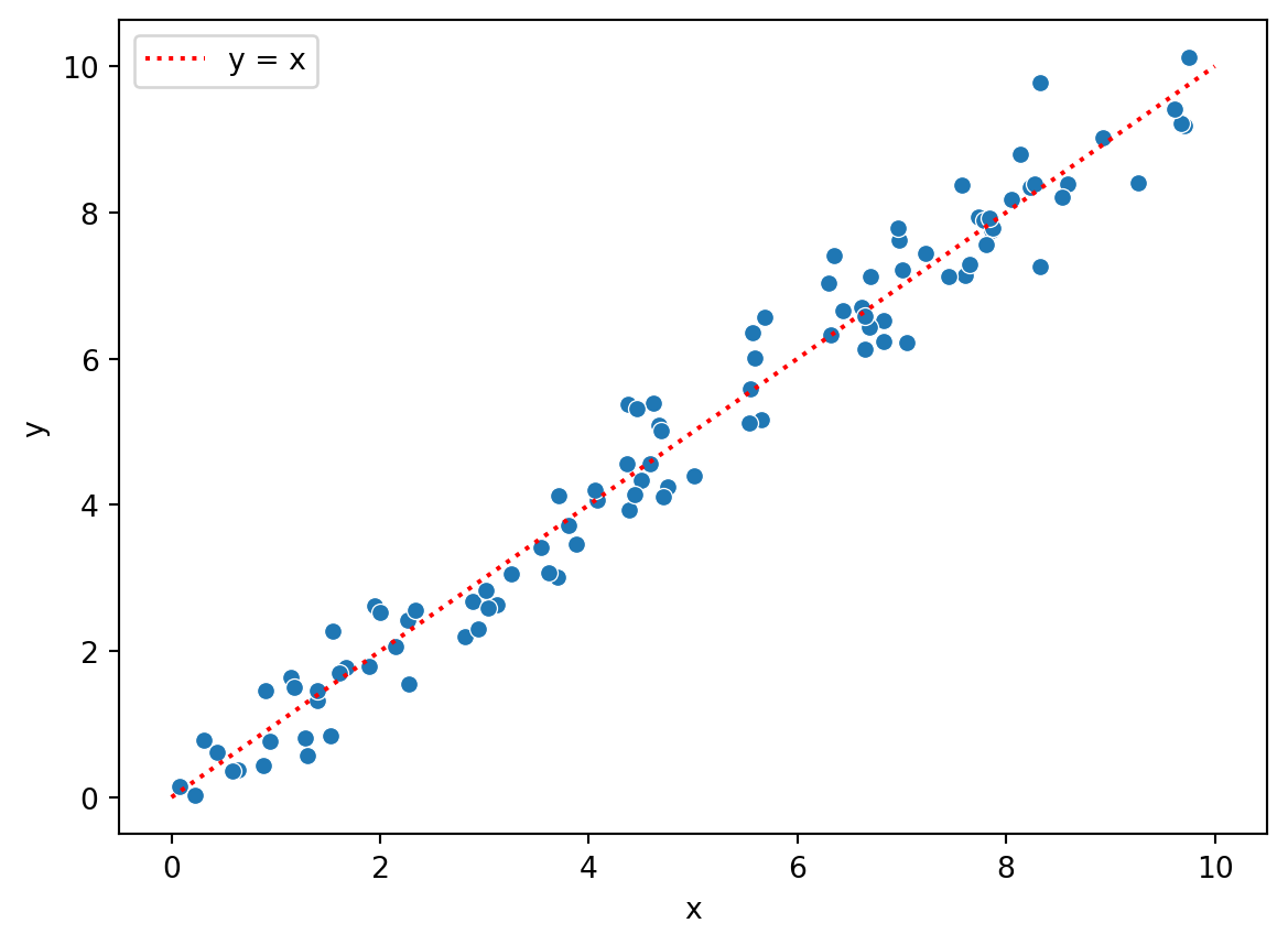 If we plot these points and add the line \(y = x\), we can see that the data is approximately linear: